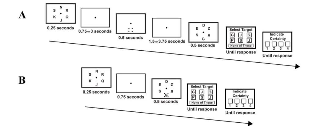 به شرکتکنندگان در این مطالعه، ابتدا ۶ یا ۸ حرف روی یک صفحه نمایش داده شد؛ سپس کارتی به نمایش درآمد که محل حرف هدف با کادری مشخص شده بود. در مرحلهی بعد، چند حرف تصادفی، برای برهمزدن حافظهی اصی شرکتکنندگان به آنها نشان داده شد. در پایان از آنها خواسته شد تا بهیاد بیاورد که در اسلاید اول، کدام حرف در ناحیهی موردنظر قرار داشته و آیا این حرف، واقعی بوده یا شبهحرف؟