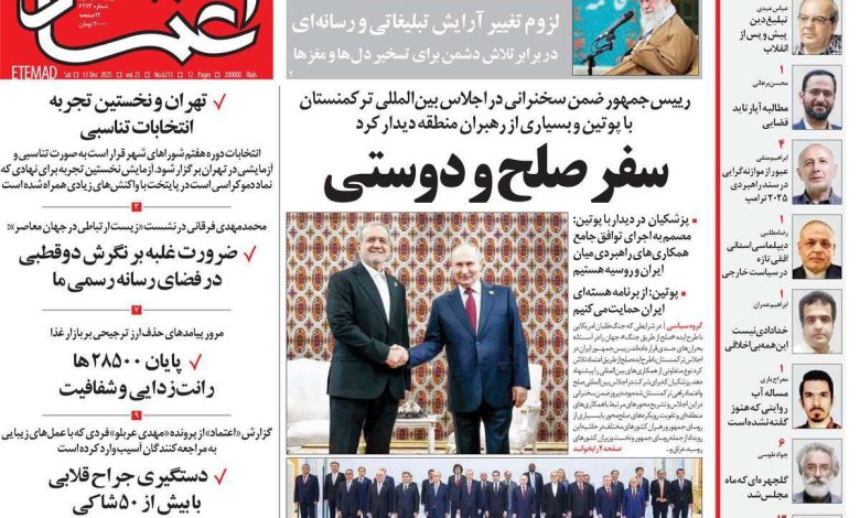 بیانات مهم رهبرمعظم انقلاب در دیدار مداحان و سفز زئسش جمهور به قزاقستان و ترکمنستان از تیترهای مطبوعات امروز است.